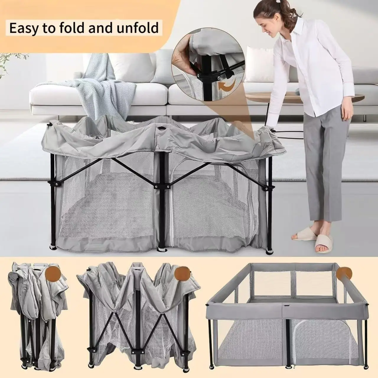 【SKŁADANE ZAGRODZENIE DLA NIEMOWLĄT】Składane zagrodzenie dla niemowląt posiada innowacyjny projekt składania, który umożliwia szybkie i łatwe montowanie oraz demontowanie – samo ustawia się w kilka sekund i może być łatwo schowane do torby, co oszczędza czas i miejsce.